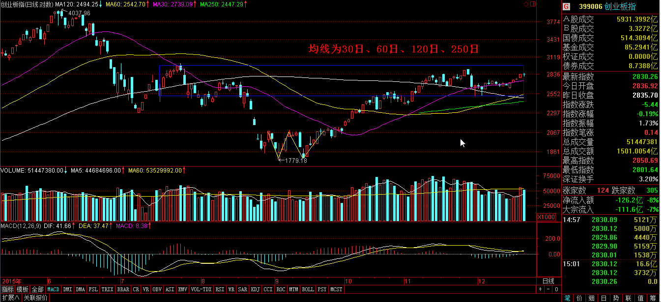 技术上看,上证指数上面还有一根重要均线压制,就是年线250日均线,深证成指和创业板指数已经站在所以短、中、长期均线之上,短期依然是强势。下图中蓝色方框内代表的股灾反弹形成的密集成交区,上证指数最弱、深证成指强、创业板指数最强,创业板指数又反弹到上轨附近。
